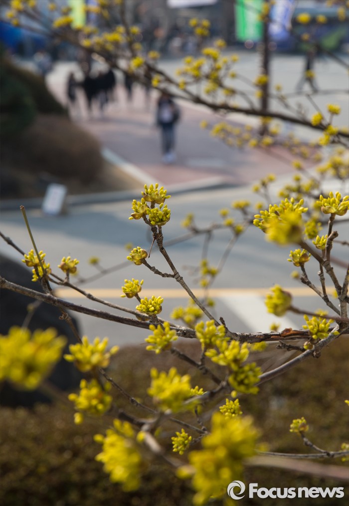 (청주=포커스뉴스) 완연한 봄 날씨를 보인 17일 오전 충북 청주시 청원구 청주대학교 캠퍼스에서 만개한 산수유 아래로 학생들이 지나고 있다.