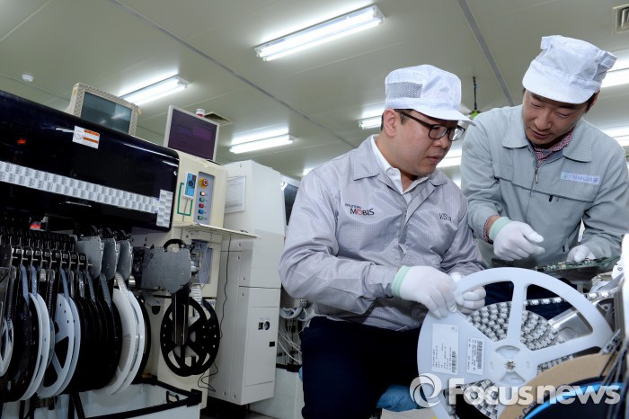 김기년 현대모비스 생산개발센터장 전무는 ”협력사 지원이 최근까지 ‘이것 저것을 고쳐보라’고 지도해주는 방식이었다면 이제는 스스로의 문제 해결 능력을 키워주는 방식으로 바뀔 필요가 있다”며 “협력사 자체 역량을 끌어올려 동반 성장의 속도를 높이겠다”고 말했다.협력사 MG전자(경기도 평택 소재) 생산 라인에서 모비스 직원이 협력사 실무 담당자에게 기술 교육을 실시하고 있다. <사진제공=현대모비스>