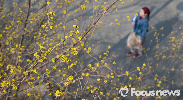 (청주=포커스뉴스) 완연한 봄 날씨를 보인 17일 오전 충북 청주시 청원구 청주대학교 캠퍼스에서 만개한 산수유 아래로 학생들이 지나고 있다.