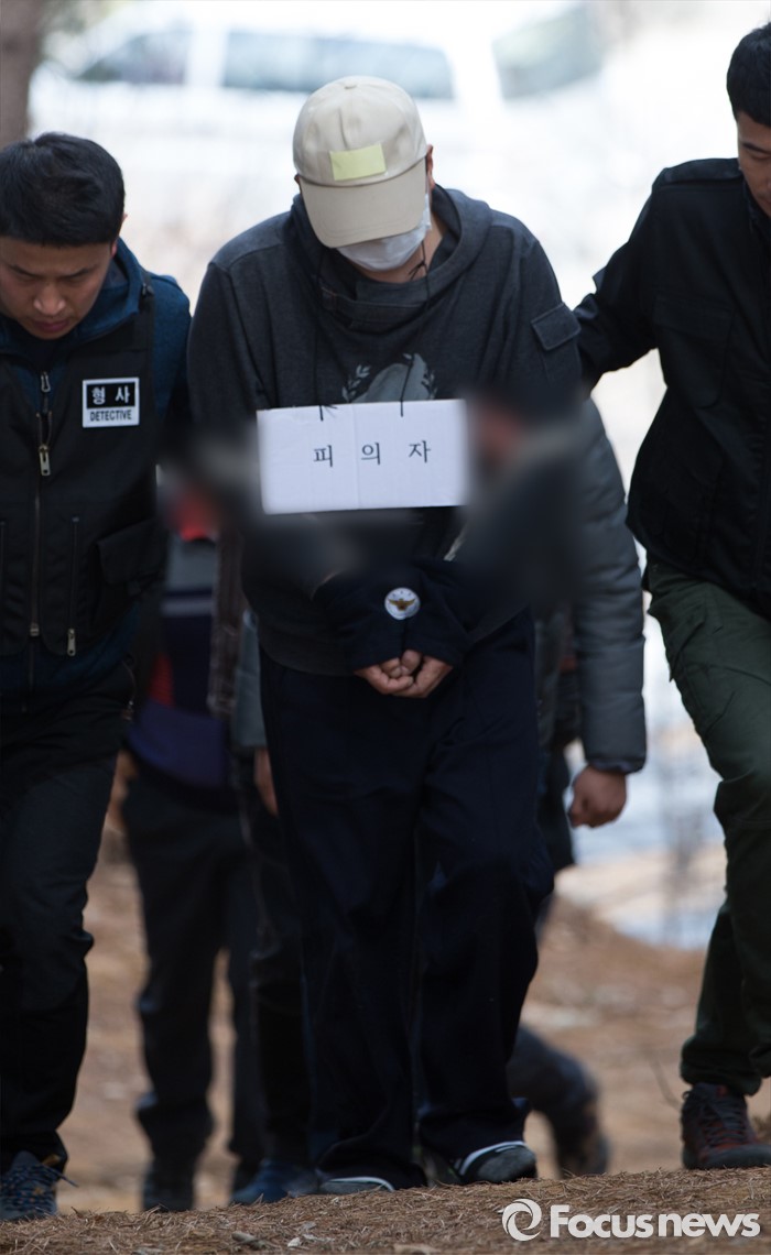 (시흥=포커스뉴스) 시각장애인 아버지를 살해 후 암매장한 아들 이모(37)씨가 17일 오전 경기도 시흥시 대야동 한 야산에서 현장검증을 하기 위해 들어서고 있다.