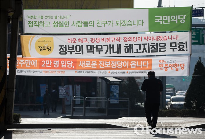 (서울=포커스뉴스) 17일 오후 서울 영등포구 당산역 주변에 다양한 주제를 담고 있는 각 정당들의 정책 홍보 현수막이 걸려 있다.