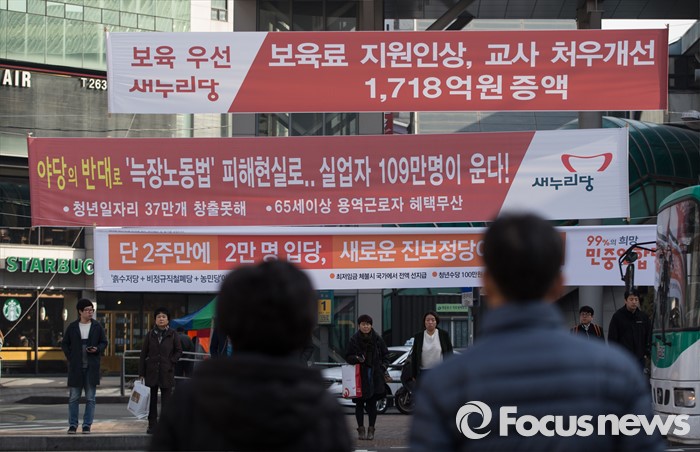 (서울=포커스뉴스) 17일 오후 서울 영등포구 당산역 주변에 다양한 주제를 담고 있는 각 정당들의 정책 홍보 현수막이 걸려 있다.