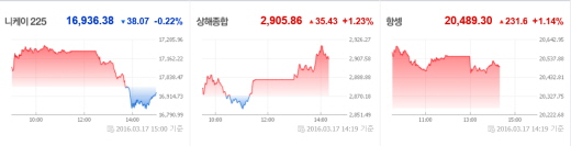 이에 반해 일본니케이225지수는 엔화 강세로 소폭의 하락세를 보였다. 니케이225지수는 전일 대비 0.22%(38.07포인트) 하락한 16936.38에 장을 마감했다.