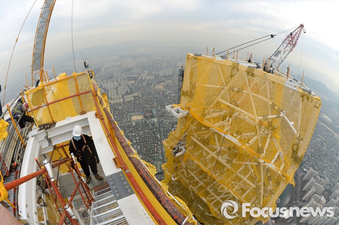 (서울=포커스뉴스) 17일 오후 서울 송파구 잠실 롯데월드타워가 최상층부의 첨탑 구조물 공사를 마치고 국내 최고 높이인 555m에 도달했다. 이날 공사 현장에서 인부들이 작업을 하고 있다.
