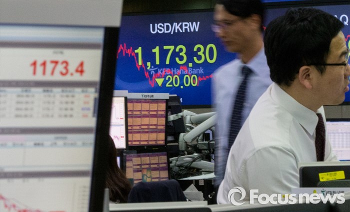 (서울=포커스뉴스) 17일 서울 중구 KEB외환은행 본점 딜링룸 전광판에 원달러환율이 전일 종가 대비 20원 내린 1173.3원를 나타내고 있다. 이날 코스피는 장중 2000선을 돌파했으며, 원·달러 환율은 전일 종가 대비 20원 내린 1173.3원으로 지난해 12월 30일(1172.5원) 이후 약 석달만에 종가 기준 1170원대를 기록했다.