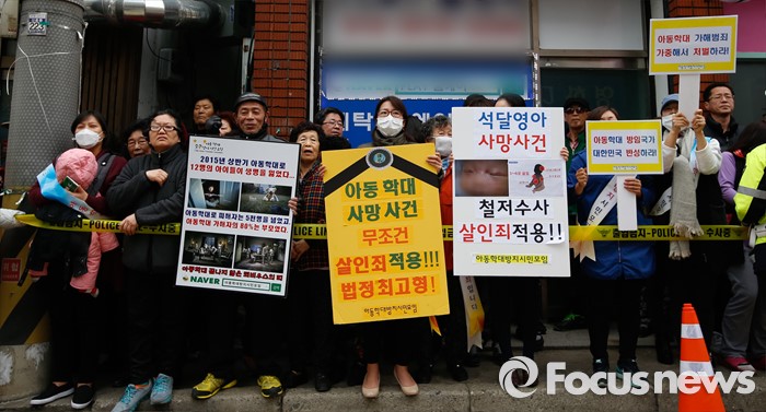 (부천=포커스뉴스) 생후 2개월 영아를 폭행해 숨지게 한 아버지 박모(23)씨와 어머니 이모(23)씨의 현장검증이 실시된 17일 오후 경기도 부천시 오정구 피의자 자택 앞에서 아동학대방지시민모임 회원들이 피의자 살인죄 적용을 촉구하는 손피켓을 들고 있다.