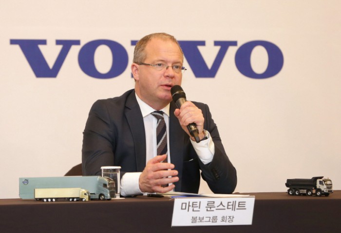 한편 지난해 10월 새로 취임한 마틴 룬스테트 볼보그룹 회장은, 유럽을 제외한 첫 해외 방문지로 한국을 선택했다. 이어 룬스테드 회장은 일본, 중국, 호주, 싱가폴 등지를 차례로 방문할 예정이다.한국을 방문한 스웨덴 볼보그룹의 마틴 룬스테드 회장이 17일 오후 서울 강서구 메이필드호텔에서 기자간담회를 갖고 발언하고 있다. <사진제공=볼보트럭코리아>17일 오후 서울 강서구 메이필드호텔에서 열린 볼보트럭코리아 기자간담회 현장. (왼쪽) 마틴 룬스테드 볼보그룹 회장 (오른쪽)김영재 볼보그룹 코리아 트럭부문 사장 <사진제공=볼보트럭코리아>