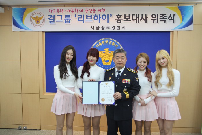 '리브하이'는 앞으로 1년동안 학교폭력과 아동학대 근절을 위한 홍보활동을 펼치게 된다.서울 종로경찰서가 걸그룹 '리브하이'를 학교폭력·학대 전담 경찰관 홍보대사로 위촉했다고 17일 밝혔다.<사진제공=서울 종로경찰서>