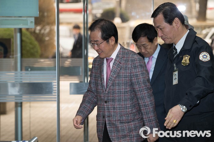 (서울=포커스뉴스) 18일 오전 서울 서초구 서울중앙지방법원에서 고(故) 성완종 전 경남기업 회장으로부터 불법 정치자금을 받은 혐의로 기소된 홍준표(62) 경남도지사가 4차 공판에 출석하고 있다.