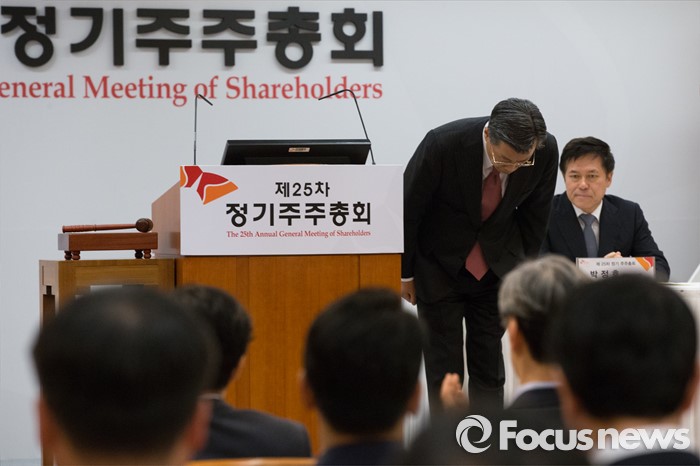 (서울=포커스뉴스) 조대식 사장이 18일 오전 서울 중구 SK본사에서 열린 제 25차 정기 주주총회에서 인사를 하고 있다.
