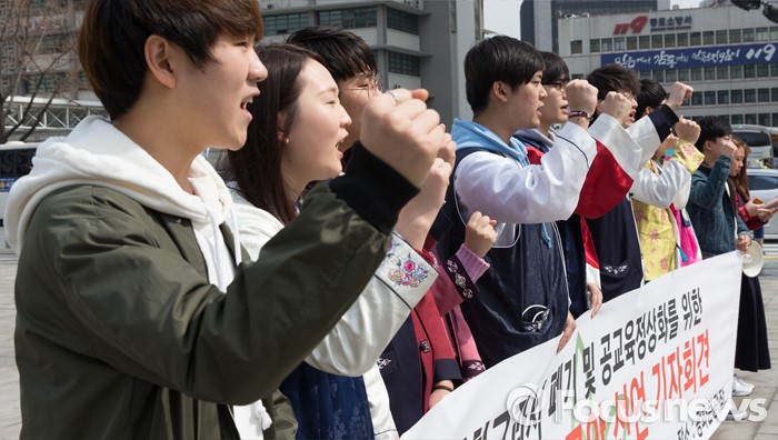 (서울=포커스뉴스) 18일 오전 서울 종로구 광화문광장에서 제4기 전국교육대학생연합이 한국사 국정화 교과서 폐기 및 공교육 정상화를 위한 예비교사 요구안 선언 기자회견을 하고 있다.