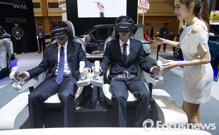 (제주=포커스뉴스) 18일 오전 제주 서귀포 제주국제컨벤션센터에서 열리고 있는 2016 국제전기자동차엑스포에서 관람객들이 기아 전기자동차 '소울' VR 시뮬레이터 체험을 하고 있다.