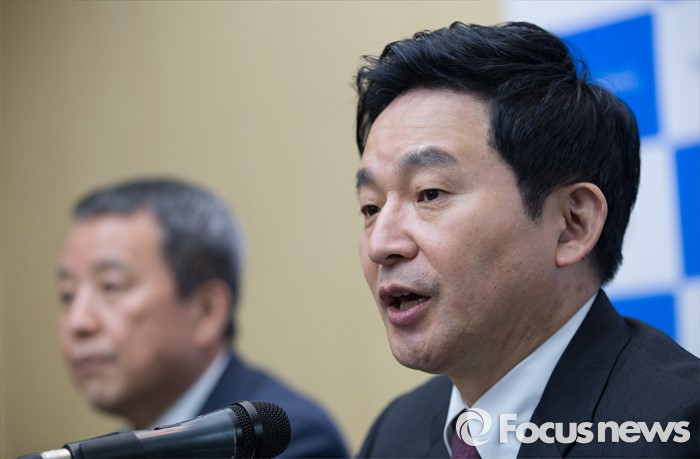 (제주=포커스뉴스) 원희룡 특별자치도지사(오른쪽)가 18일 오전 제주 서귀포 제주국제켄벤션센터에서 열린 제3회 국제전기자동차엑스포에서 김대환 국제전기차엑스포 조직위원장과 함께 기자회견을 하고 있다.