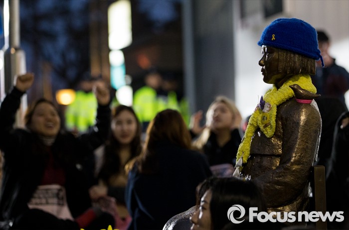 (서울=포커스뉴스) 18일 오전 서울 종로구 일본대사관 앞에서 열린 '한일 위안부 합의 폐기, 소녀상 철거 반대 대학생 100인 농성'에 참석한 학생들이 소녀상 곁을 지키고 있다.
