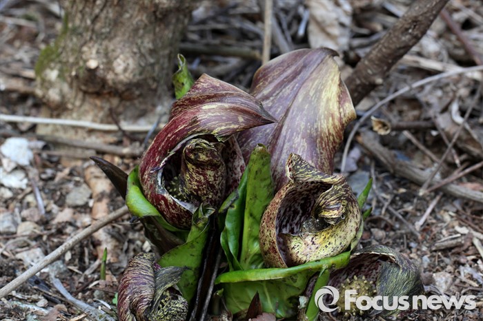 (하남=포커스뉴스)봄 기운이 완연한 19일 오전 경기도 하남시 검단산자락에 앉은부채들이 겨우내 얼었던 대지를 뚫고 돋아나 새봄을 알리고 있다. 보랏빛을 띠는 꽃이 먼저 피고 잎은 꽃이 시든 후에 펼쳐진다.<사진제공=이준택교수>