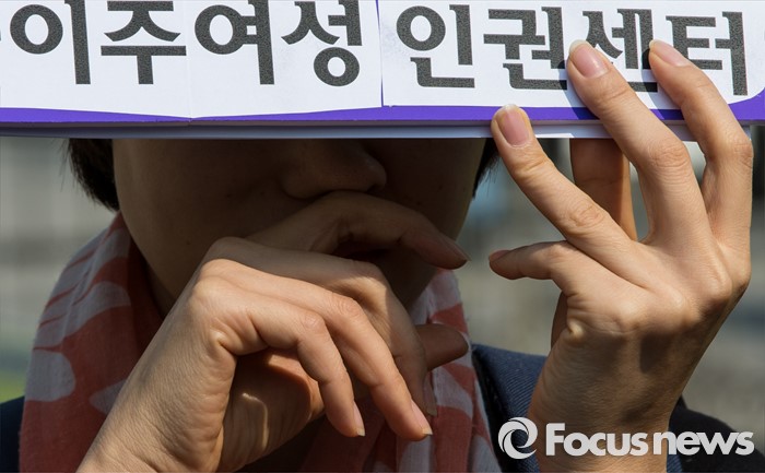 (서울=포커스뉴스) 21일 오전 서울 광화문 광장에서 열린 '세계인종차별철폐의 날 맞이 제 이주 인권 노동 사회단체 국제연대 공동 기자회견'에 참석한 베트남 이주여성이 인종차별에 반대하는 손팻말을 들고 있다.