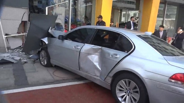 (서울=포커스뉴스) 21일 오후 3시 54분쯤 서울 서초구 강남대로에서 고급 외제차가 버스와 부딪친 뒤 상가로 돌진했다.