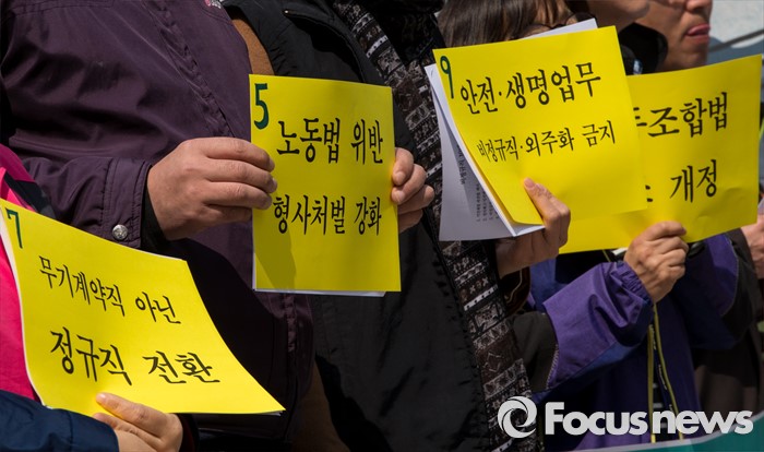 (서울=포커스뉴스) 22일 오전 서울시청 인근에서 열린 2016 비정규직 총선연대 발족식에 참석한 비정규직 노동자들이 정규직 전환, 파견법 폐지 등 요구사항이 적힌 손팻말을 들고 있다.