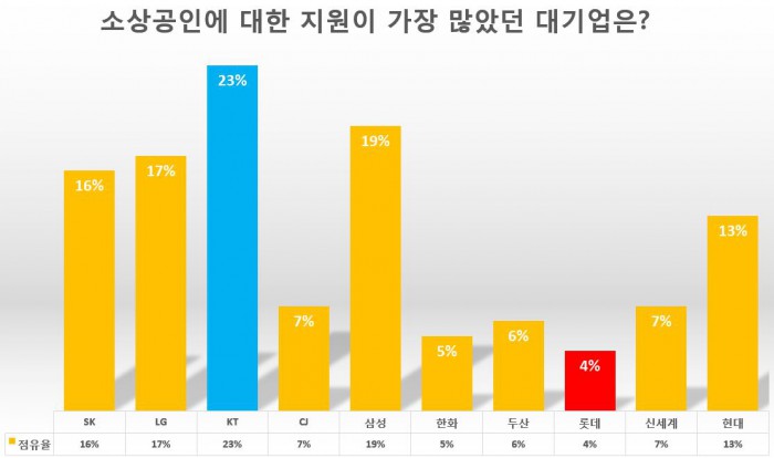 조사 결과에 살펴보면, 소상공인에 대한 지원이 가장 많았던 기업으로는 대기업의 경우 KT가 23%로 가장 많은 득표를 했다. 이어 삼성(19%), LG(17%), SK(16%) 등이 뒤를 이었다. 금융권 기업은 KEB하나금융(26%)이 가장 높았으며, NH금융(24%), 국민금융(19%), 신한금융(16%) 순이었다.
