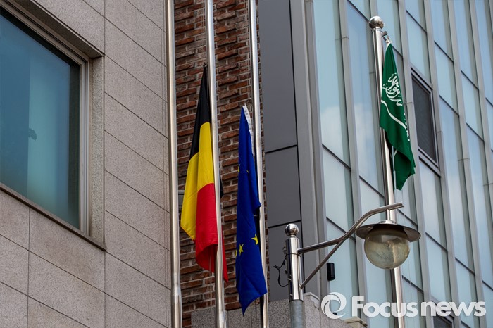 (서울=포커스뉴스) 23일 오전 서울 용산구 주한벨기에 대사관 앞에 지난 22일 벨기에 브뤼셀에서 발생한 동시 다발 테러 희생자들을 추모하는 조기가 게양돼있다.