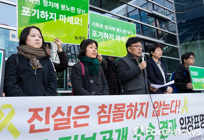 (서울=포커스뉴스) 23일 오후 서울행정법원 앞에서 열린 '청와대 상대 정보공개 소송 결과' 관련 기자회견에 참석한 하승수 녹색당 공동운영위원장이 판결 결과와 향후 대응방향에 대해 밝히고 있다.