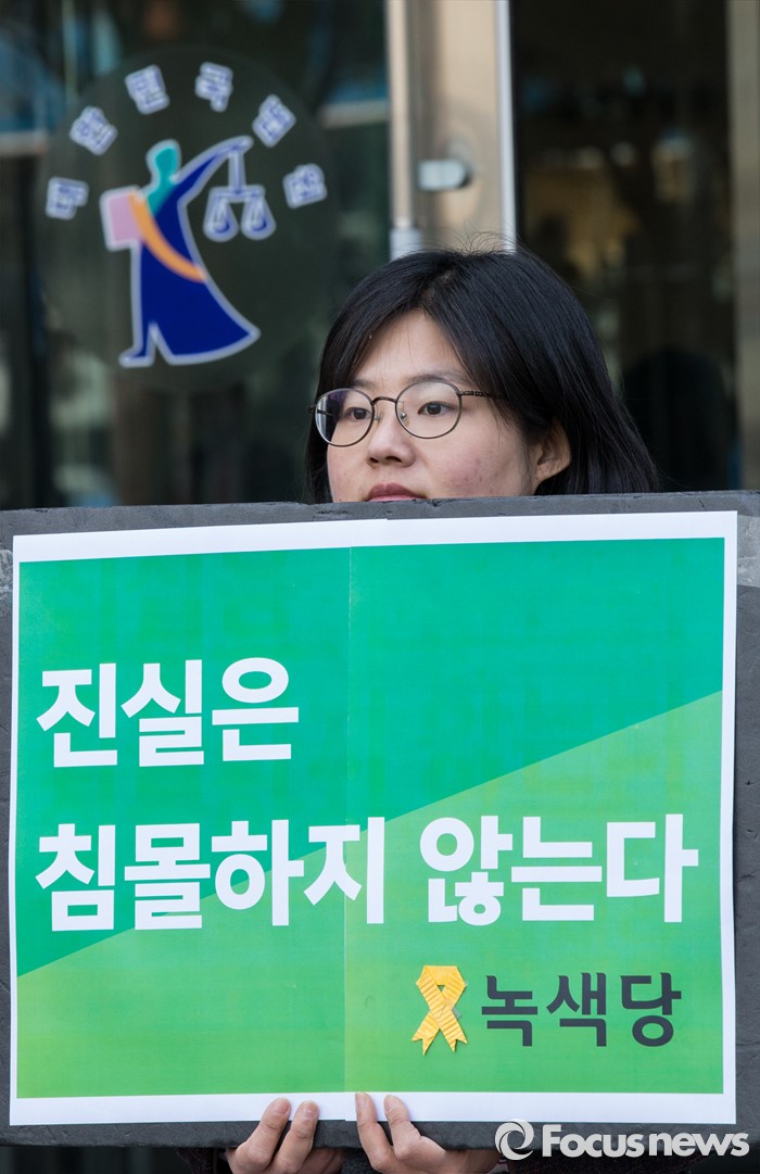 (서울=포커스뉴스) 23일 오후 서울행정법원 앞에서 열린 '청와대 상대 정보공개 소송 결과' 관련 기자회견에 참석한 녹색당원이 '진실은 침몰하지 않는다'라는 문구가 적힌 손팻말을 들고 있다.