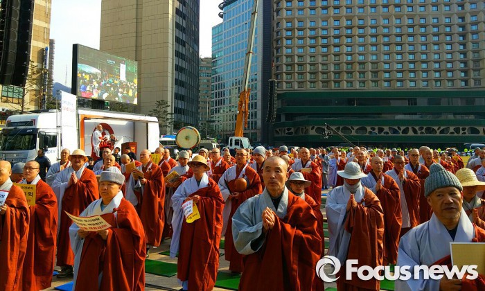 (서울=포커스뉴스) 대한불교조계종이 "한전부지를 돌려달라"며 대규모 기원법회를 열고 서울시를 규탄했다.
