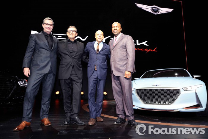한편 이번 뉴욕 모터쇼에서 처음 단독 부스와 프레스 행사를 마련한 제네시스는 뉴욕 콘셉트를 비롯해 G90 2대와 G80 1대를 추가로 전시해 미국 럭셔리카 시장 공략에 박차를 가할 계획이다.루크 동커볼케현대자동차 디자인센터장, 피터 슈라이어 현대∙기아자동차 디자인담당, 맨프레드 피츠제럴드 제네시스 브랜드 전략담당, 어윈 라파엘 현대자동차 미국법인(HMA) 제네시스 브랜드 담당(왼쪽부터)이 24일 뉴욕 모터쇼에서 최초로 공개한 4도어 스포츠 세단형 콘셉트카 '뉴욕 콘셉트' 앞에서 기념촬영하고 있는 모습. <사진제공=현대기아차>