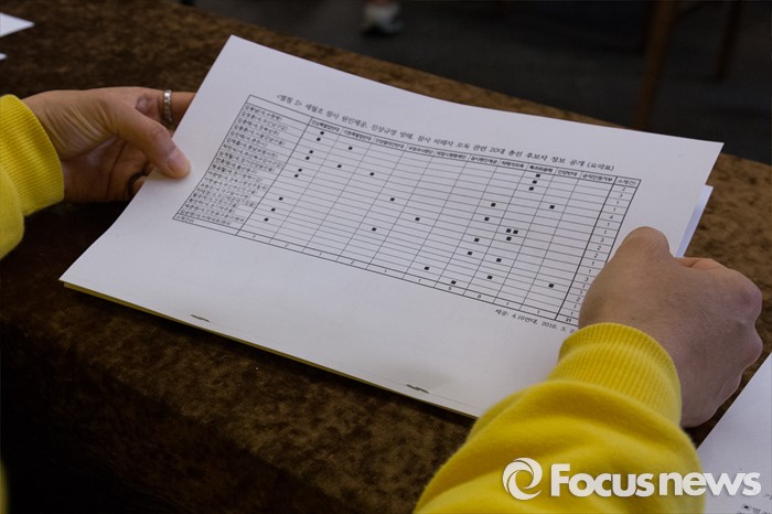 (서울=포커스뉴스) 24일 오전 서울 중구 프란치스코 회관에서 이태호 416연대 상임운영위원이 세월호참사 관련 20대 총선 기억·심판·약속 운동계획 발표 기자회견장에서 세월호 참사 모독관련 총선 후보자 명단을 발표하고 있다.