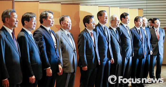 이 팀장은 이어 "19대 국회에서도 사외이사 비율을 높이거나 규제대상을 확대하려는 법안이 여러 건 계류되었는데, 이렇게 규제를 강화하기 보다는 사외이사 풀 확대, 사외이사의 이사회 참석률 제고와 발언비율을 높이는 방안을 강구하는 것이 바람직하다"고 지적했다.(서울=포커스뉴스) 황교안 국무총리가 서울 영등포구 전국경제인연합회관에서 열린 '전경련 회장단 초청만찬'에 자리해 회장단과 사진촬영을 하고 있다. 왼쪽부터 박영주 이건산업 회장, 권오준 포스코 회장, 최태원 SK 회장, 정몽구 현대자동차그룹 회장, 황교안 국무총리, 허창수 전국경제인연합회 회장, 이준용 대림산업 회장, 신동빈 롯데그룹 회장, 김윤 삼양홀딩스 회장, 추경호 국무조정실장, 이승철 전국경제인연합회 부회장. 강진형 기자
