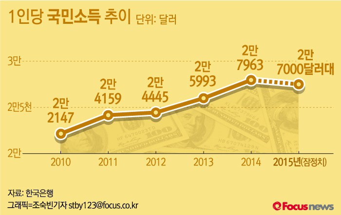 한국의 1인당 국민소득은 지난 2008년 2만464달러에서 금융위기 당시였던 2009년 1만8346달러로 미끄러졌다. 그 뒤 2010년 2만2147달러, 2011년 2만4159달러, 2012년 2만4445달러, 2013년 2만5993달러, 2014년 2만7963달러를 기록, 7년 연속 상승행진을 이어갔으나 줄곧 2만불대에 머물렀다.