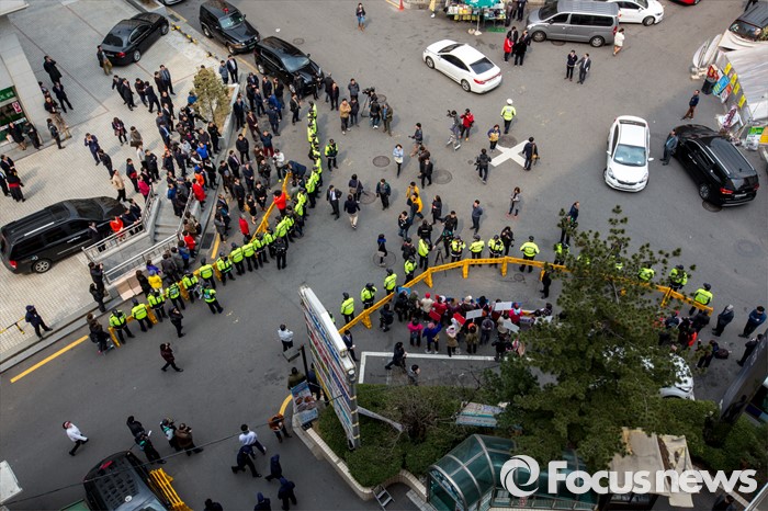 (서울=포커스뉴스) 새누리당이 최고위원회의를 열어 의결이 보류된 6개 지역구에 대한 추인 문제를 논의하고 있는 25일 오후 서울 영등포구 새누리당사 앞에서 '옥새투쟁'을 이어가고 있는 김무성 새누리당 대표의 행동을 규탄하는 당원과 옹호하는 당원들이 각자의 의견을 내세우고 있다.