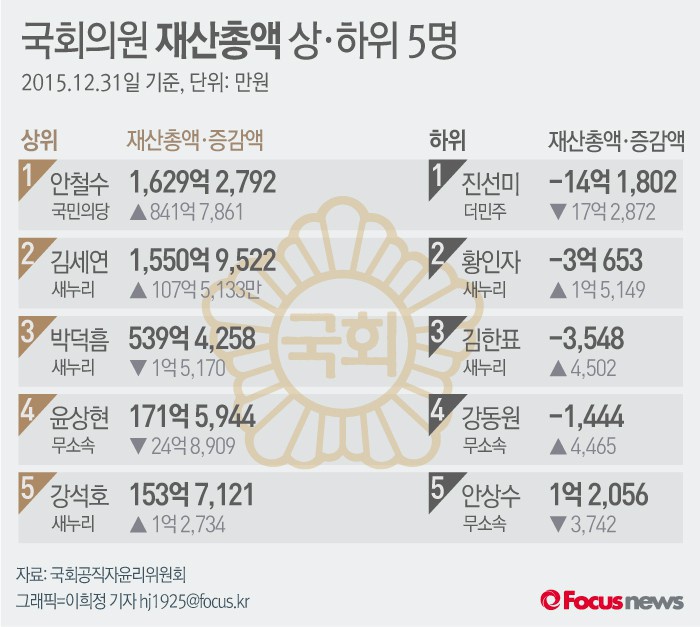 (서울=포커스뉴스) 25일 국회공직자윤리위원회가 발표한 '2015년도 국회의원 재산변동 신고 내역'에 따르면 재산이 가장 많은 국회의원은국민의당 안철수 상임공동대표(1629억2792만원)로 밝혀졌다. 더불어민주당 진선미 의원은 -14억 1,802만원으로 재산 최하위를 기록했다.