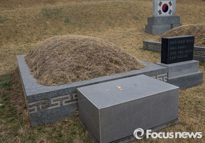 (서울=포커스뉴스) 안중근 의사 순국 106주기를 하루 앞둔 25일 오후 서울 용산구 효창공원 내 삼의사묘역에 마련된 안 의사 허묘.