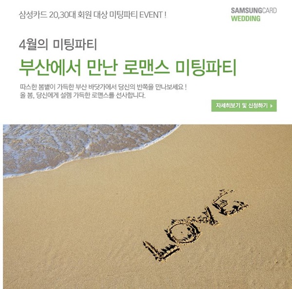 (서울=포커스뉴스) 결혼정보회사 가연은 다음달 23일 삼성카드 회원 중 20~30대 미혼남녀 각 8명(총 16명)을 대상으로 '로맨스 미팅파티'를 개최한다고 25일 밝혔다.