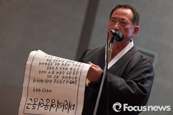 (서울=포커스뉴스) 26일 오전 서울 중구 안중근의사기념관에서 열린 '안중근의사 순국 106주기 추모식'에서 성재경 시인이 추모 헌시를 읽고 있다.