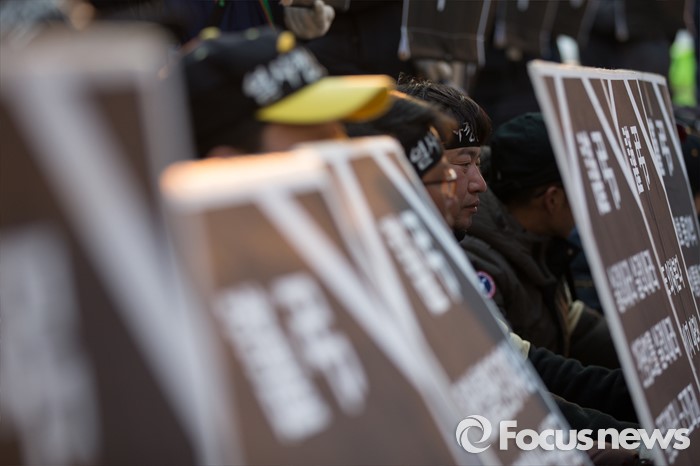 (서울=포커스뉴스) 26일 오후 서울 중구 모전교에서 '2016 총선투쟁 승리 범국민대회' 행진을 끝내고 유성기업 지회조합원들이 피켓시위를 하고 있다. 유성기업 공대위는 故 한광호 조합원 죽음의 원인이 된 노조파괴를 중단하고 유성기업과 현대기아차의 처벌을 요구하고 있다.