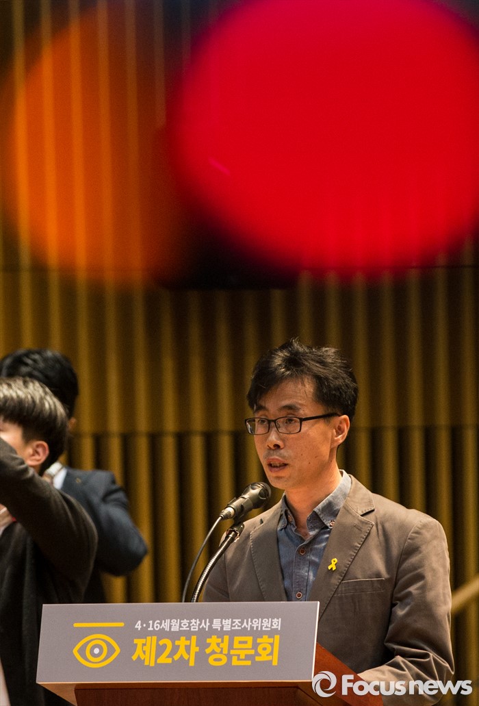 (서울=포커스뉴스) 28일 오전 서울시청 다목적홀에서 세월호 참사 특별조사위원회의 제2차 청문회가 열렸다. 이날 청문회에 참석한 전명선 세월호 가족협의회 운영위원장이 대표발언을 하고 있다.