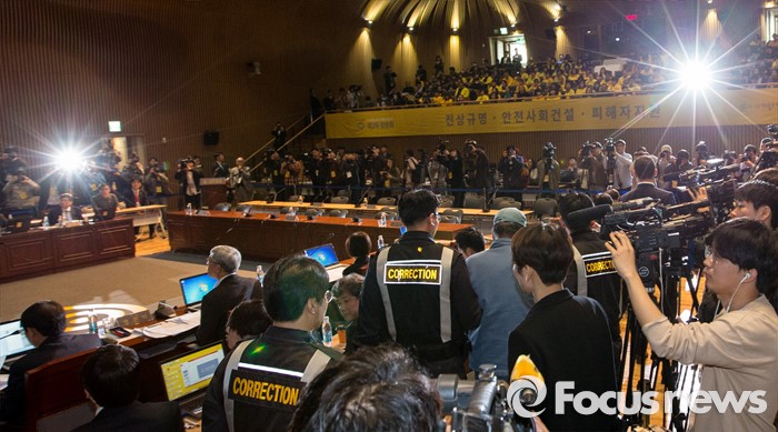 (서울=포커스뉴스) 28일 오전 서울시청 다목적홀에서 세월호 참사 특별조사위원회의 제2차 청문회가 열렸다. 이날 청문회에 증인으로 참석한 이준석 선장이 증인석으로 향하고 있다.