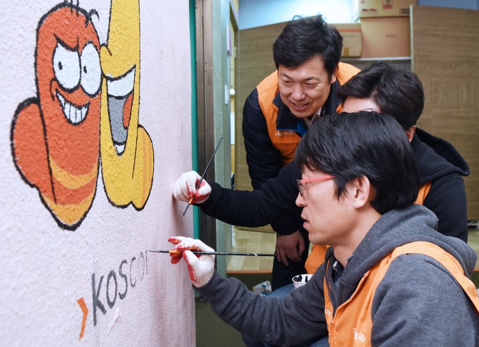 코스콤 임직원 40여 명은 지난 24~25일 서울 영등포구 두레민들레 지역아동센터를 찾아 놀이터 벽화에 라바, 도라에몽, 헬로키티, 박지성 등 캐릭터 그리기 봉사활동을 진행했다.코스콤 임직원 40여 명은 지난 24~25일 서울 영등포구 두레민들레 지역아동센터를 찾아 놀이터 벽화그리기 봉사활동을 펼쳤다(사진제공=코스콤)