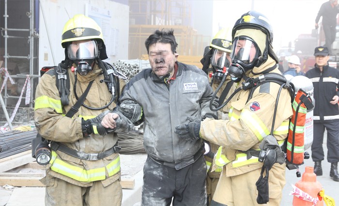 (서울=포커스뉴스) 28일 오후 서울 강서구 마곡동 한 오피스텔 공사장에서 화재가 발생, 강서소방서 대원들이 현장에 있던 근로자들을 구조하고 있다. <사진제공=강서소방서>