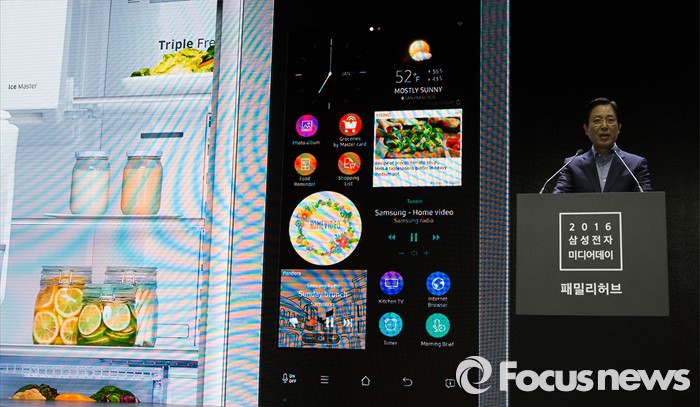 (서울=포커스뉴스) 서병삼 삼성전자 생활가전사업부 부사장이 30일 오전 서울 강남구 삼성전자 서초사옥에서 열린 '2016 삼성전자 패밀리 허브' 미디어데이에 참석해 제품소개를 하고 있다.