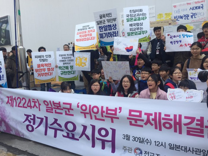이성대 전교조 서울지부 지부장은 "한국 교원단체의 한 사람으로서 위안부 문제는 자라나는 학생들에게 제대로 가르쳐야 한다"며 "정부는 일본 정부에 철저한 진상조사는 물론 제대로된 역사교육을 하도록 요구해야 한다"고 발언했다.30일 서울 종로구에서 열린 제1224차 정기 수요집회에 참여한 서울 염경초등학교 학생들이 일본군 위안부 문제 해결을 촉구하고 있다. 박지선 기자