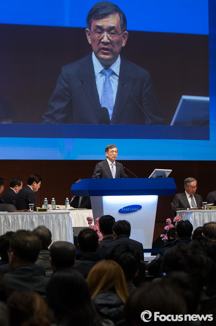 지난 11일 오전 서울 서초구 삼성전자 본사 다목적홀에서 열린 47기 정기주주총회에 참석한 권오현 이사회 의장(대표이사 부회장)이 인사말을 하고 있다. 2016.03.11 양지웅 기자2016.03.30 신성아 기자