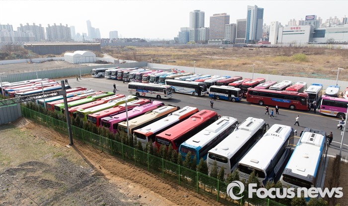 (서울=포커스뉴스) 31일 오후 서울 용산구 신라아이파크면세점 주차장이 중국 아오란 그룹 임직원들을 태우고 온 버스들로 가득하다.