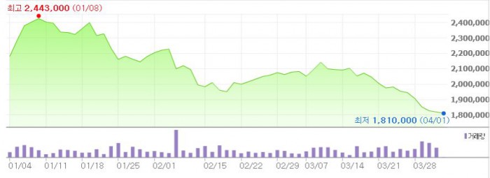 조 연구원은 "1분기 연결 매출액은 5697억원, 영업이익은 388억원으로 전년 동기 대비 각각 6.3%, 7.2% 늘어나는 데 그쳐 컨센서스를 밑돌 것"이라고 관측했다.최근 3개월간 롯데칠성 주가 추이 <그래픽출처=네이버>
