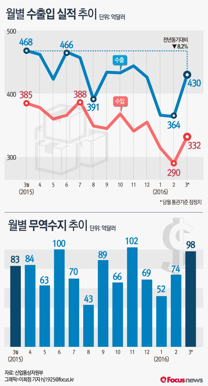 산업통상자원부는 1일 '2016년 3월 수출입동향'을 통해 3월 수출액이 430억 달러를 기록해 8.2% 감소했다고 밝혔다. 감소율은 지난해 11월(-5%) 이후 4개월 만에 한 자리 수로 줄었다. 수출액은 지난해 12월부터 지난 2월까지 3개월째 두자릿수 급감하는 폭락세를 기록한 바 있다.
