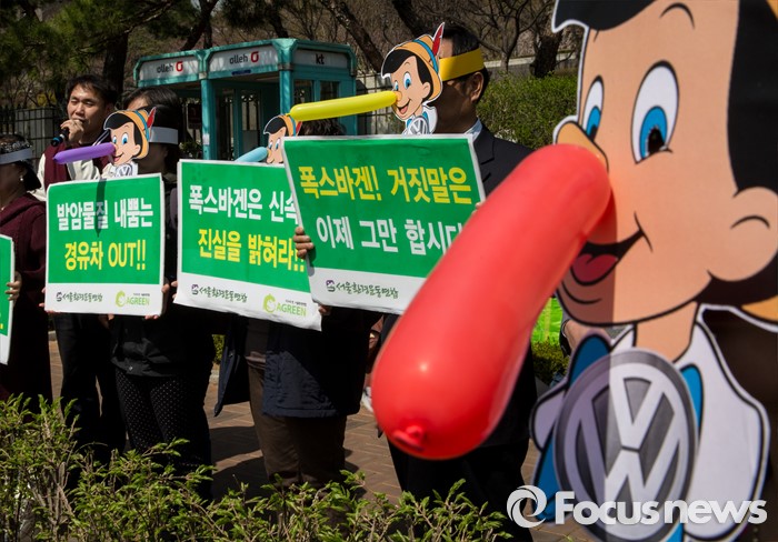 (서울=포커스뉴스) 1일 오전 서울 서초구 서울중앙지법에서 피노키오 탈을 쓴 서민민생대책위원회, 서울환경연합 회원들이 '아우디ㆍ폭스바겐 규탄 및 피해보상 촉구' 기자회견을 열고 있다.