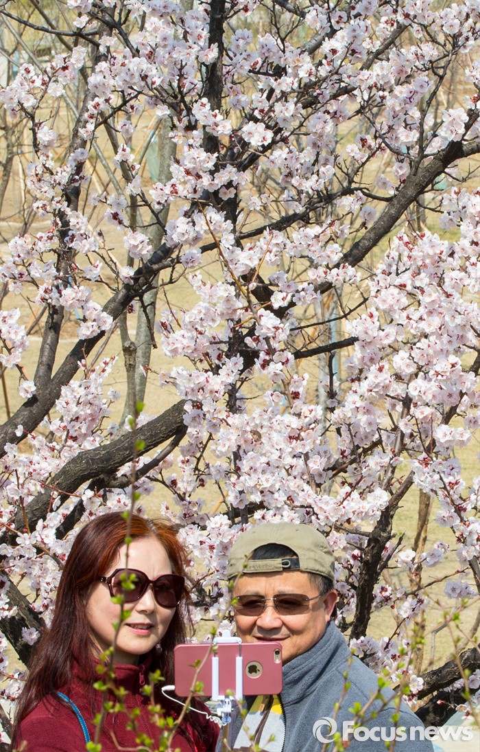 (서울=포커스뉴스) 봄 기운이 완연한 1일 오후 서울 여의도 한강공원을 찾은 중국인 관광객들이 만개한 벚꽃 앞에서 사진을 찍고 있다.