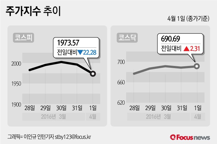 (서울=포커스뉴스) 1일 코스피지수는 전날 보다 1.12%(22.28포인트) 내린 1973.57에 장을 마쳤다. 코스닥지수는 전일 대비 0.34%(2.31포인트) 오른 690.69에 마감했다.